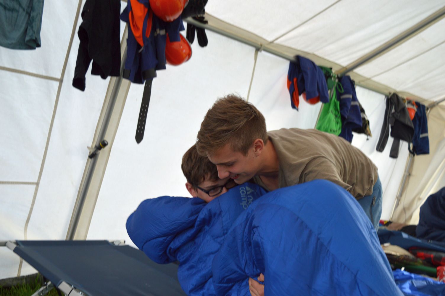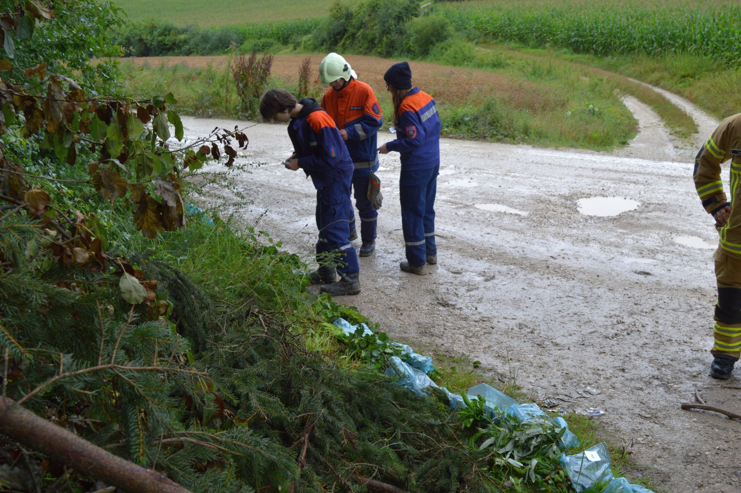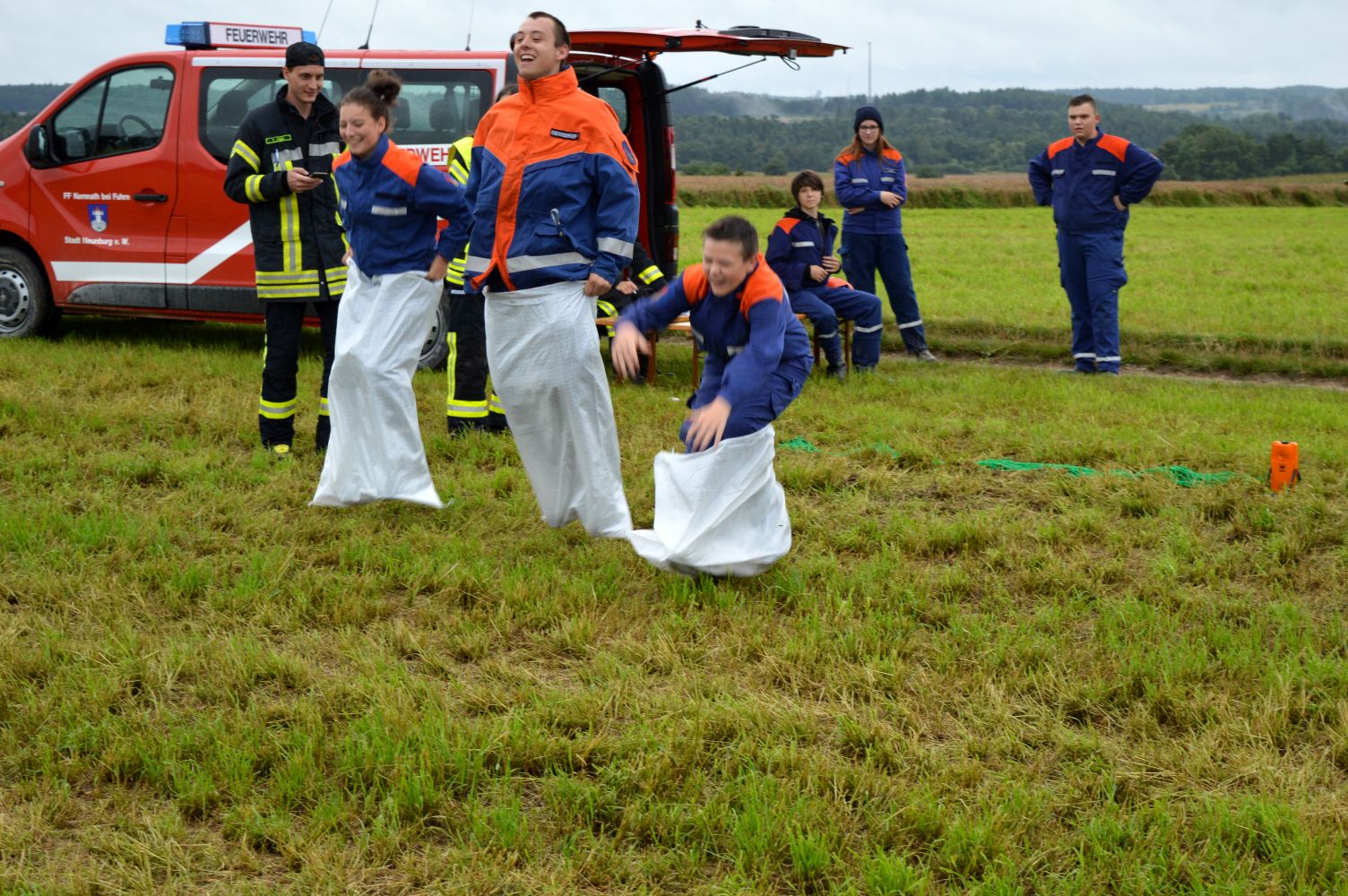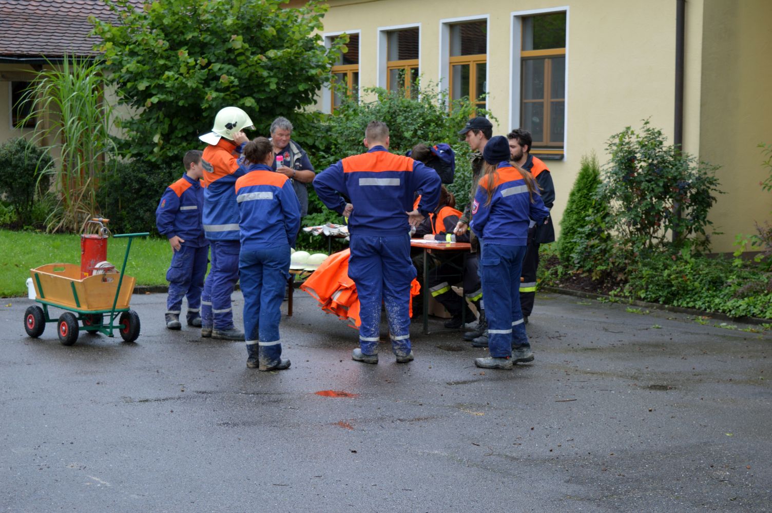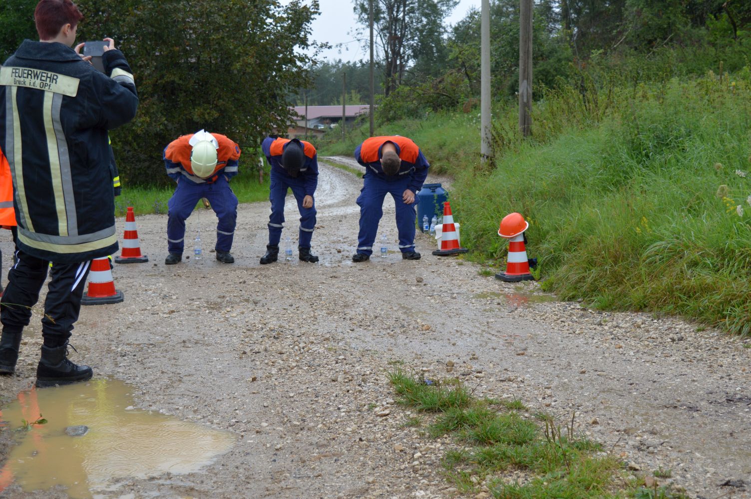 Am Freitag hatte der Wettergott kein Einsehen mit den Jungfeuerwehrlern. Die Lagerolympiade musste wegen des Regenwetters verspätet gestartet werden. Aber nachdem die Ersten Gruppen gestartet waren rissen die Regenwolken auf und das Wetter besserte sich soweit, dass die Lagerolympiade einigermaßen trocken zu Ende gebracht wurde. Auf der Strecke mussten die Jugendlichen feuerwehrtechnisches Geschick, Feuerwehrwissen und sportliche Leistungsfähigkeit beweisen. Zur Regeneration konnte hinterher im Freizeitbad „Bulmare“ in Burglengenfeld entspannt werden bevor der Lagergottesdienst durch Pfr. Hüttinger / Eichstätt und Pfarramtsanwärter Daniel Schmid aus Burglengenfeld zelebriert wurde. Musikalisch wurde der Lagergottesdienst von der Jurablaskapelle Pilsheim gestaltet. Der Blumenschmuck für den Altar wurde von Andrea und Bianca Koller aus Pilsheim angefertigt.